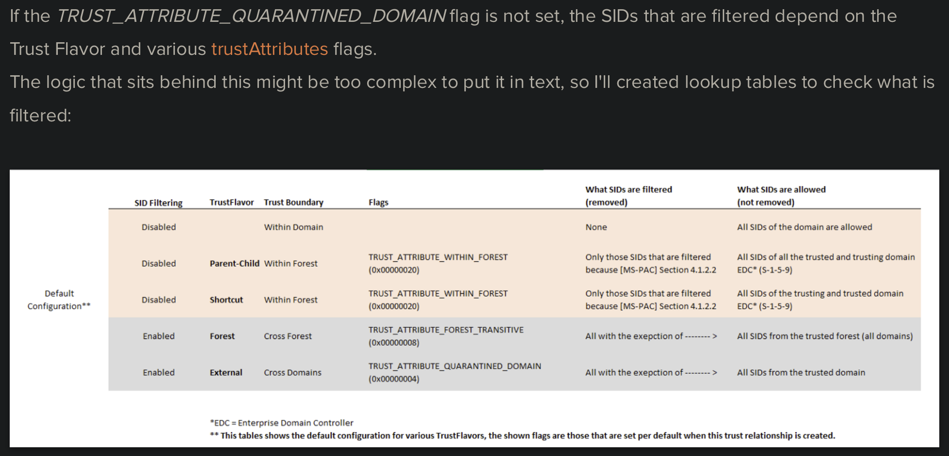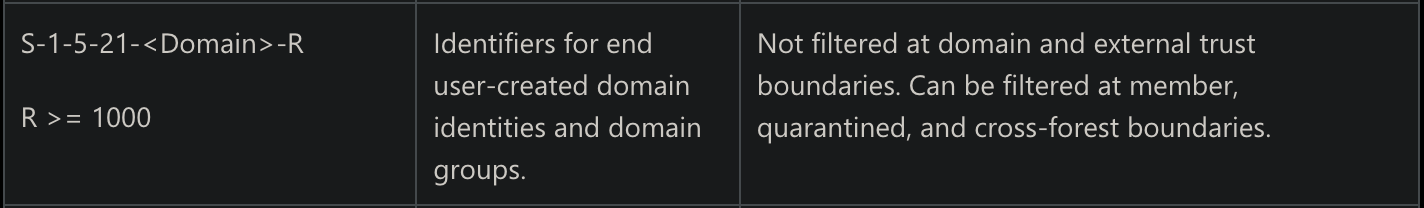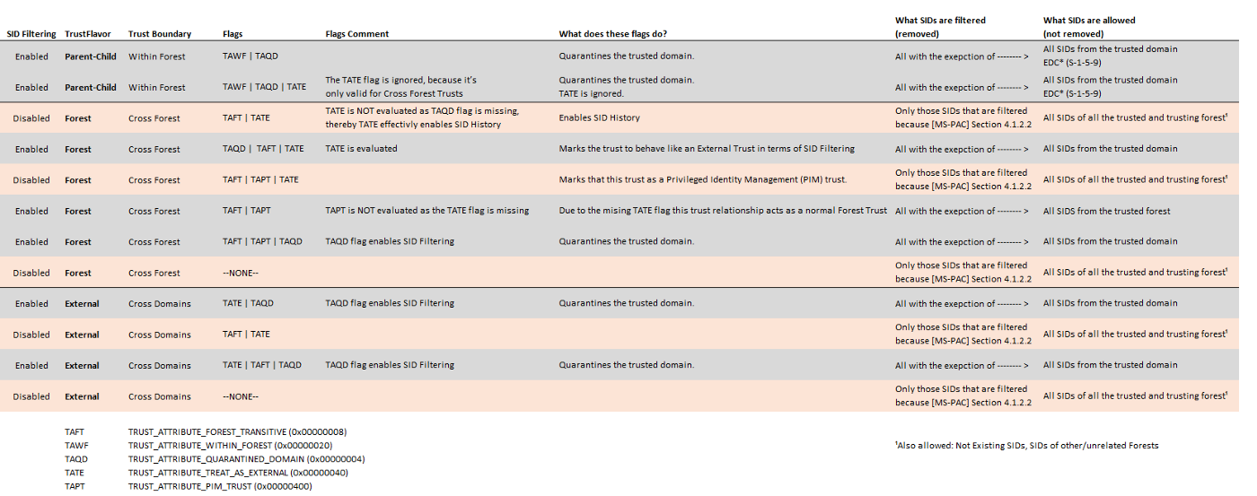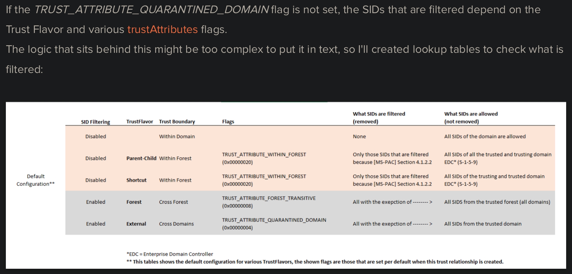 TRUST_ATTRIBUTE_QUARANTINED_DOMAIN (0x00000004)flag is set, then only SIDs from the trusted domain are allowed (all others are filtered(by Carsten Sandker on www.securesystems.de)
